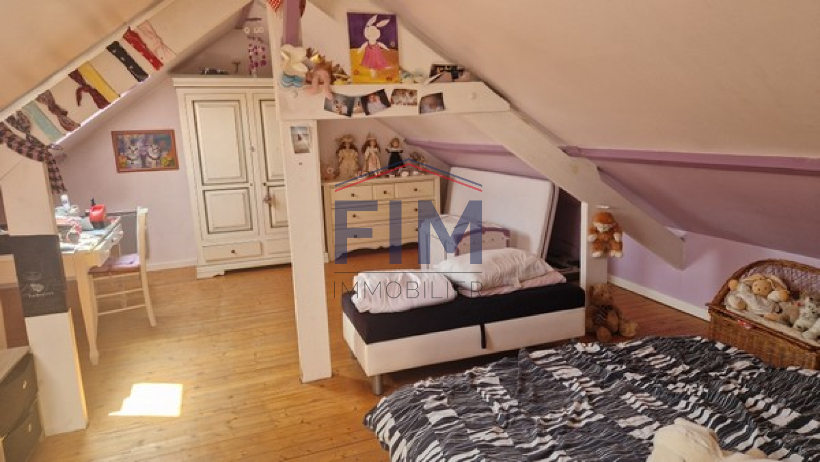 Une habitation d'environ de 107 m² divisée au rez de chaussée une cuisine aménagée, un séjour, deux chambres, salle de bains. A l'étage : 1 palier, 2 chambres, un dressing. Un garage complète cette propriété.