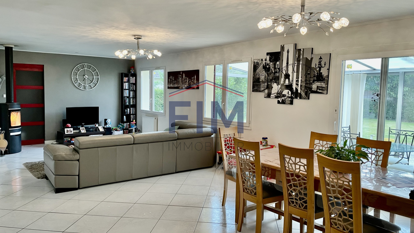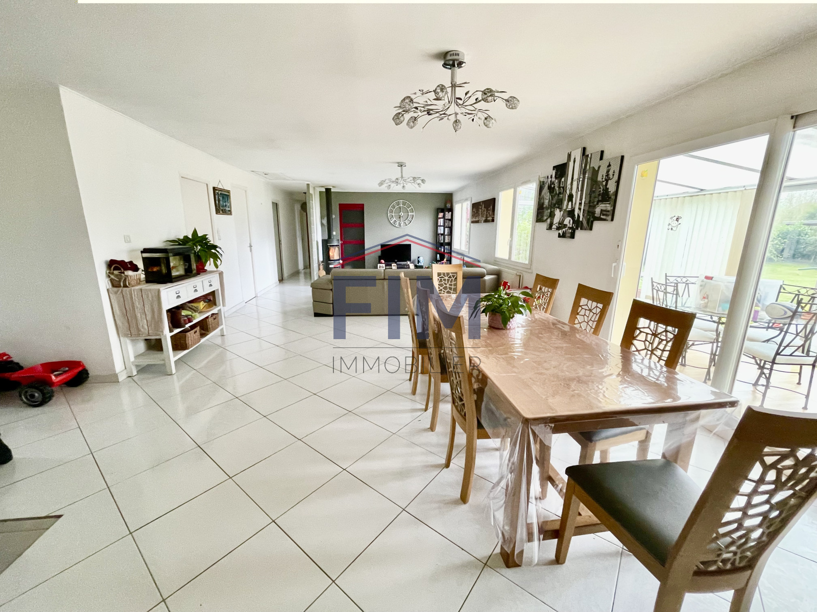 Une entrée, une cuisine ouverte équipée, un séjour/salon avec poêle à bois de 40 m², 4 chambres, salle de bains avec baignoire et douche, dressing, véranda avec baie coulissante en alu,