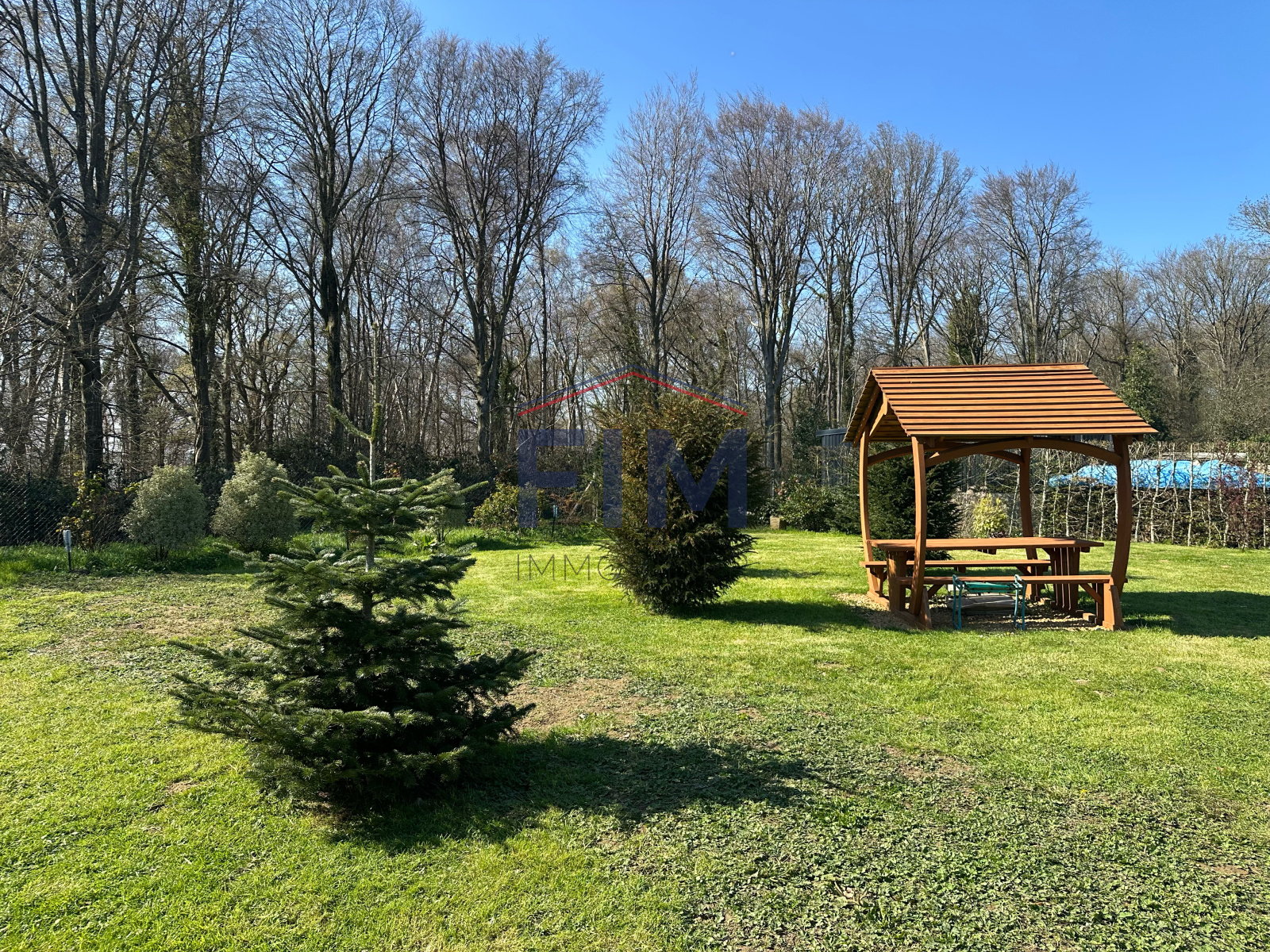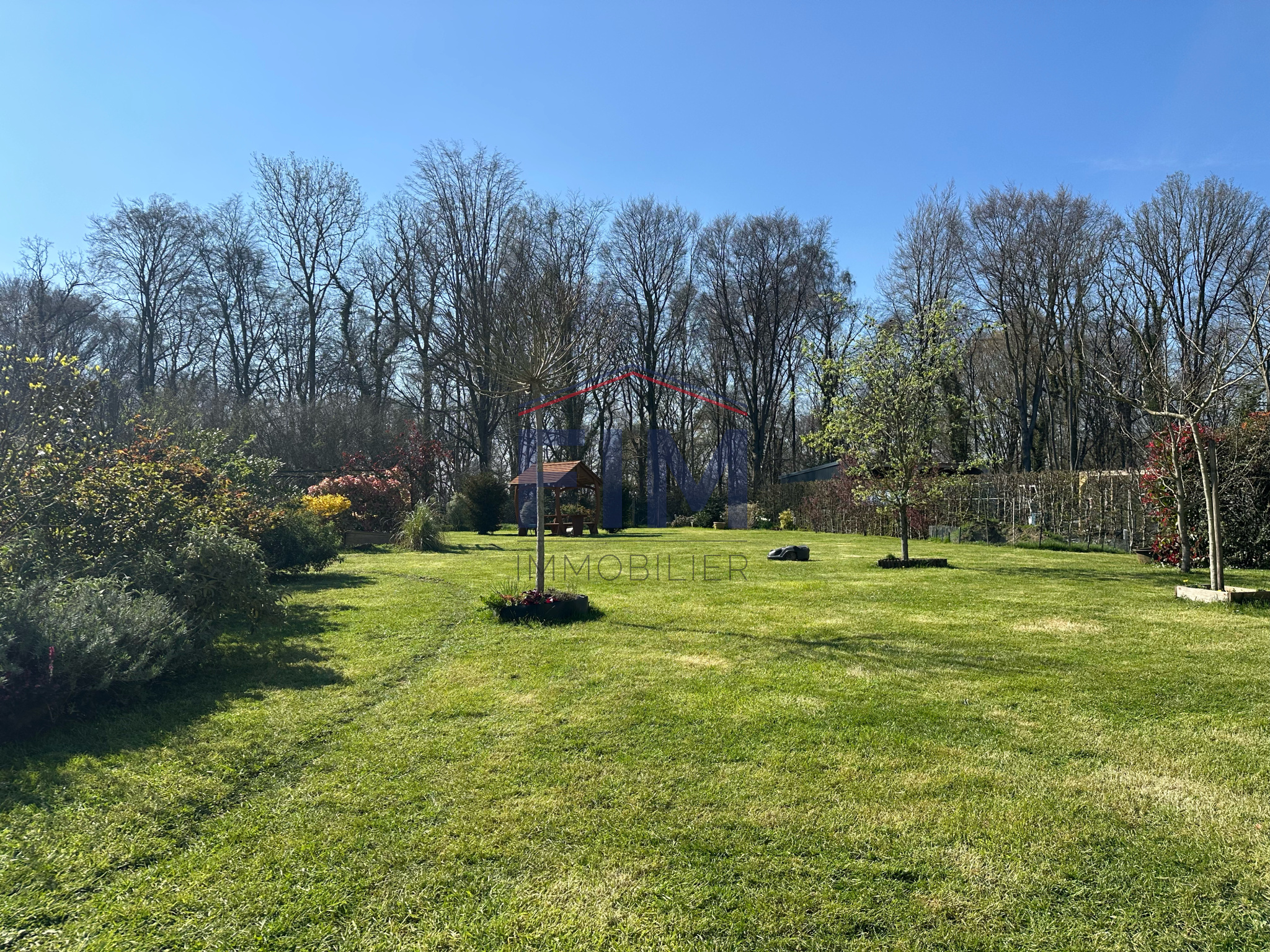 À l’extérieur, un joli jardin clos et arboré avec massifs fleuris, terrasse avec store et vue sur la forêt, entrée et descente de sous-sol entièrement goudronnée avec portail électrique.