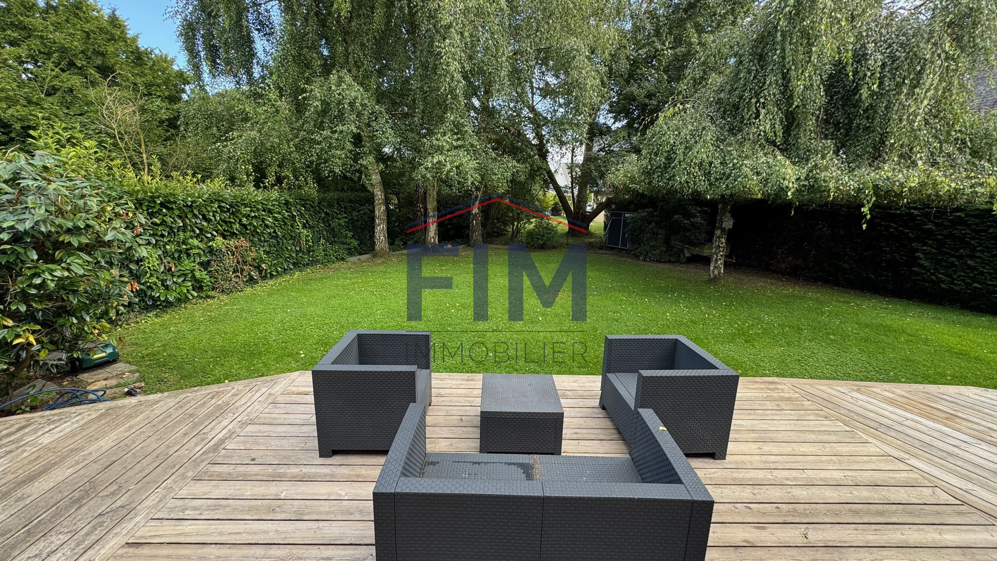 A l'extérieur, le terrain arboré d'environ 600 m², parfaitement orienté, invite à la détente. La grande terrasse en bois, prolongée par une cuisine d'été avec barbecue, crée un véritable espace de vie supplémentaire aux beaux jours. Le jardin, facile d'entretien, profite d'un environnement verdoyant et sans vis-à-vis direct.